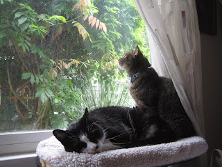 Today it was not sunny, nor was it rainy. We spent the morning inside watching the birds twittering around the feeder. Well, at least Alice did. The keeper had a meeting at STM about her classes this coming year. But when she came home we went out, and she started Reading Week! We aren't sure what this means for her, but we know it means we get to be outside.
